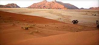 | Weiter in Richtung Namib-Wüste sehen wir mit etwas Glück die ausgewilderten Pferde, die von der deutschen Schutztruppe hier freigelassen wurden und sich heute der Wüste angepasst haben. Wir übernachten in der Kulala Lodge oder der Sossusvlei Lodge unweit des Sossusvlei, dem wir am nächsten Morgen früh beim Sonnenaufgang einen Besuch abstatten. | ![]() |